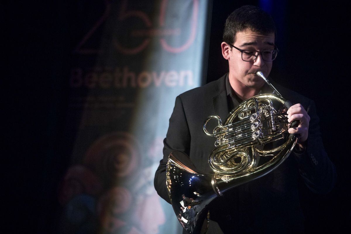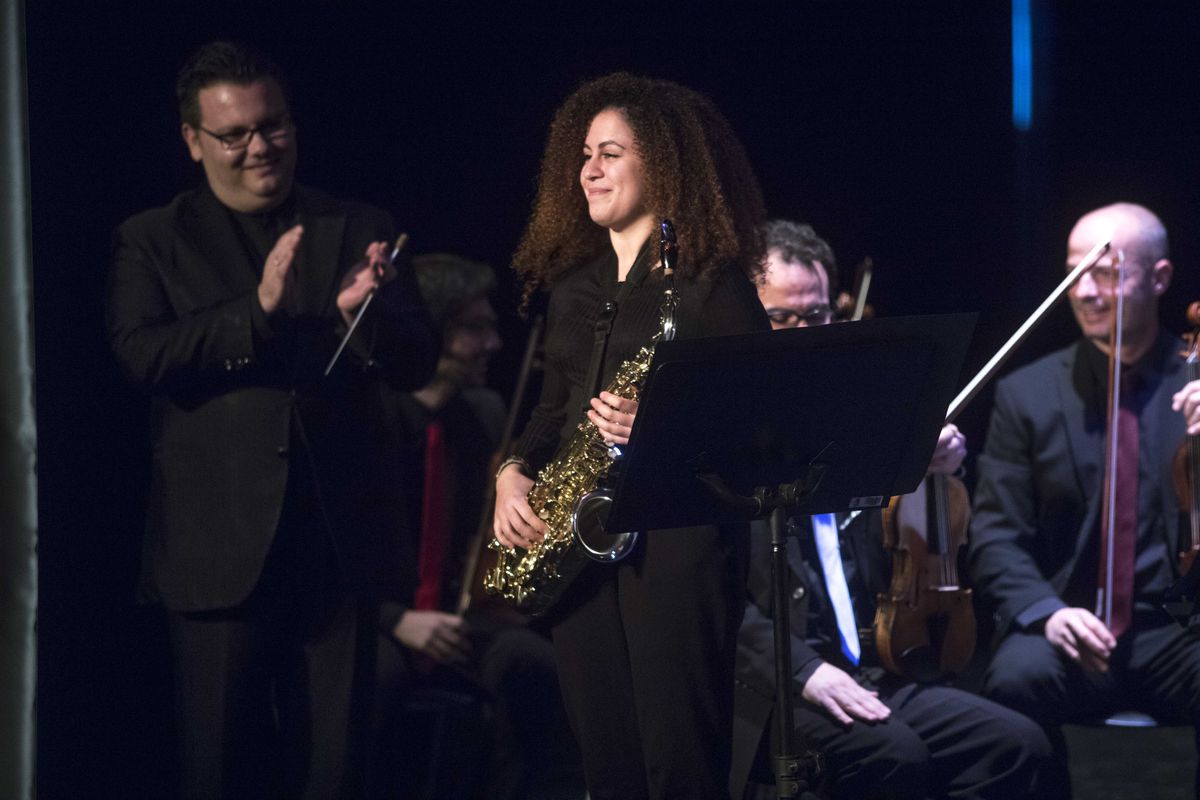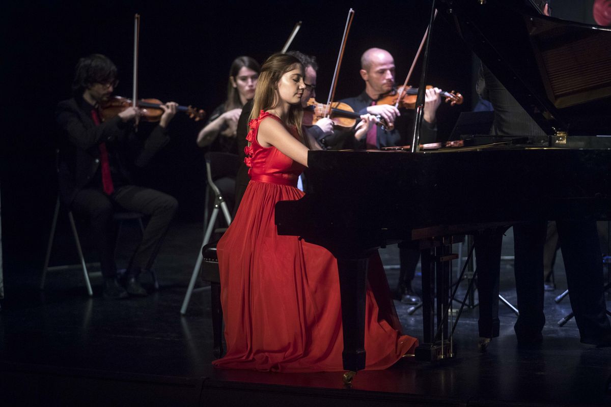 Seguidamente, comenzó el primero de los cinco solistas de la noche, antiguo alumno del Conservatorio de Jumilla y, actualmente, cursando sus estudios en el Conservatorio Superior de Música “Joaquín Rodrigo” de Valencia, Alberto López Bernal (trompa), con el Concierto N.º 4 en Mib KV. 495 para trompa y orquesta de W.A. Mozart, continuó Marcos García Barrera, con el Concierto N.º 3 en Sol KV 216 para violín y orquesta de W.A Mozart. Le siguió Marta García de Andrés Martínez que interpretó la Rapsodia Sinfónica para piano y orquesta Op. 66 de J. Turina, prosiguió Daniel Madrid Jordán acompañado de Mamen Fernández (cantaora) y Alejandro Solano (cajón) con la pieza Callejón del aire. Bulería de E. de Melchor, con arreglo de Andrés Pérez. El punto final estuvo a cargo de la alumna del Conservatorio de Jumilla “Julián Santos” Paula Soriano Ibáñez, interpretando Concierto en Mib Op. 109 para saxofón y orquesta de cuerda de A. Glazounov.